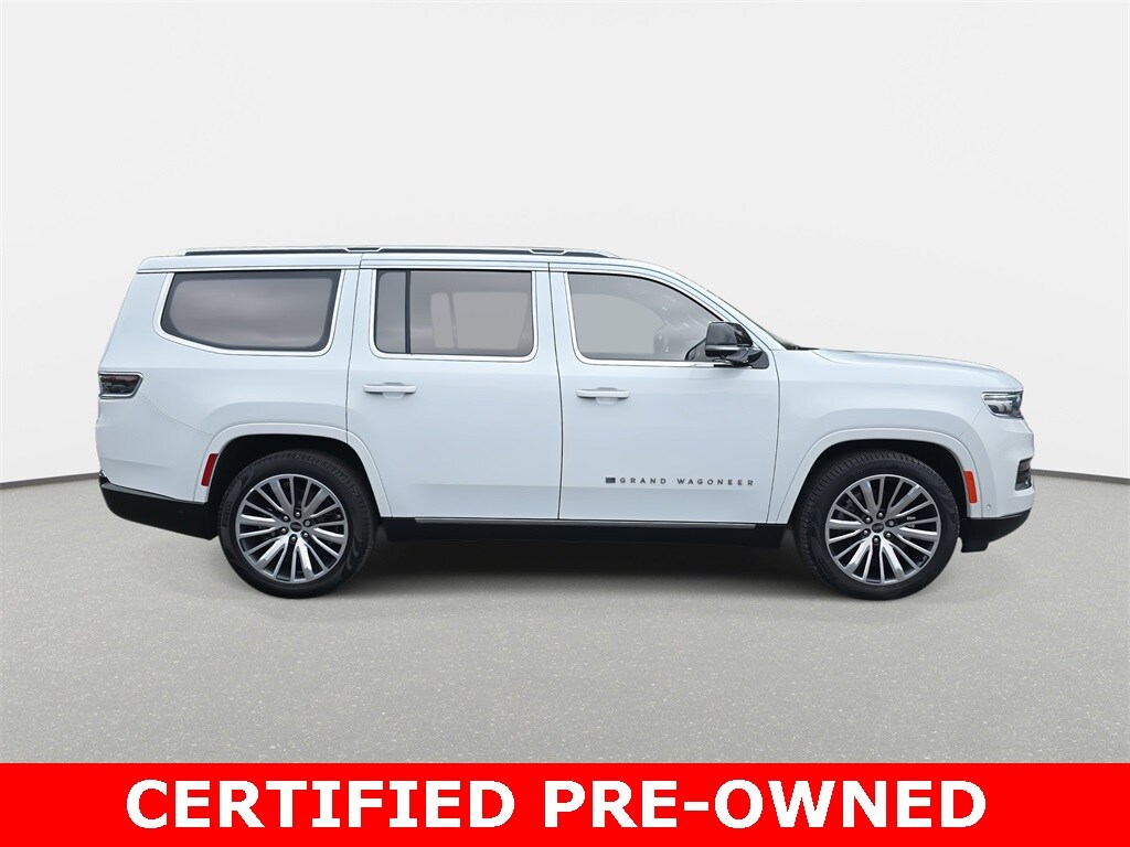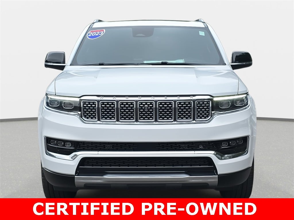 Clean CARFAX. 2023 Jeep Grand Wagoneer Series III 4WD Bright White Clearcoat 4WD 8-Speed Automatic 3.0L I6 *LOCAL TRADE*, *REMAINDER OF FACTORY WARRANTY*, *INCLUDES WARRANTY*, *CLEAN HISTORY...NO ACCIDENTS REPORTED*, *ONE OWNER...NO ACCIDENTS REPORTED*, *ONE OWNER*, *BOUGHT HERE NEW*, *BACKUP CAMERA*, *BLUETOOTH*, *NAVIGATION*, *SUNROOF*, *THIRD ROW SEATS*, *APPLE CARPLAY/ANDROID AUTO*, *ALUMINUM ALLOY WHEELS*, *LEATHER*, *HEATED SEATS*, *POWER PACKAGE*, 3rd row seats: bench, 4-Wheel Disc Brakes, ABS brakes, Adjustable pedals, Air Conditioning, Alloy wheels, Body Color Roof, Front Bucket Seats, Heated front seats, Heated rear seats, Heated steering wheel, Leather steering wheel, Memory seat, Navigation System, Panic alarm, Pedal memory, Power driver seat, Power moonroof, Power windows, Premium Leather Trimmed Bucket Seats, Quick Order Package 28W, Reclining 3rd row seat, Remote keyless entry, Security system, Speed control, Split folding rear seat, Steering wheel memory, Steering wheel mounted audio controls, Tilt steering wheel, Traction control, Two Tone Paint Group, Ventilated front seats, Ventilated rear seats, Wheels: 22" x 9.0" Premium 4 Aluminum.