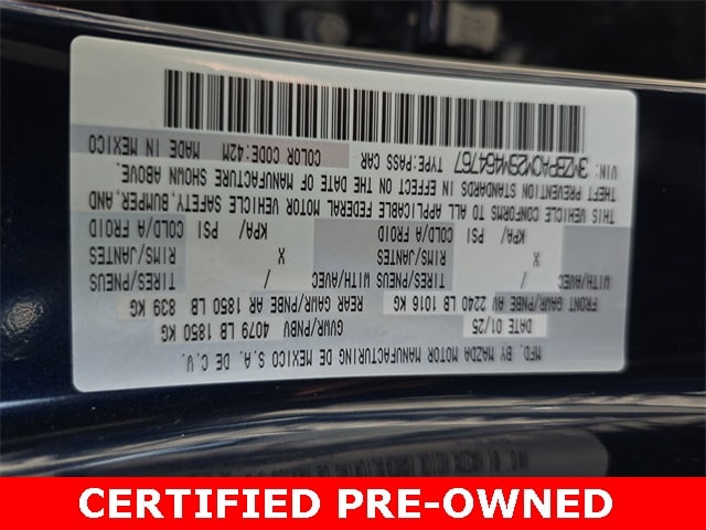 *MAZDA CERTIFIED*, *REMAINDER OF FACTORY WARRANTY*, *INCLUDES WARRANTY*, *CLEAN HISTORY...NO ACCIDENTS REPORTED*, *ONE OWNER...NO ACCIDENTS REPORTED*, *ONE OWNER*, *BACKUP CAMERA*, *BLUETOOTH*, *SUNROOF*, *APPLE CARPLAY/ANDROID AUTO*, *ALUMINUM ALLOY WHEELS*, Mazda3 2.5 S Preferred Package FWD, 4D Sedan, 2.5L I4 DOHC 16V LEV3-SULEV30 191hp, 6-Speed Automatic, FWD, Deep Crystal Blue Mica, Black w/Leatherette Seat Trim, 4-Wheel Disc Brakes, ABS brakes, Air Conditioning, Alloy wheels, AppLink/Apple CarPlay and Android Auto, Exterior Parking Camera Rear, Front Bucket Seats, Heated front seats, Heated Front Sport Bucket Seats, Leather Shift Knob, Leather steering wheel, Leatherette Seat Trim, Memory seat, Panic alarm, Power driver seat, Power moonroof, Power windows, Remote keyless entry, Speed control, Split folding rear seat, Steering wheel mounted audio controls, Telescoping steering wheel, Tilt steering wheel, Traction control, Wheels: 18" x 7J Aluminum Alloy.