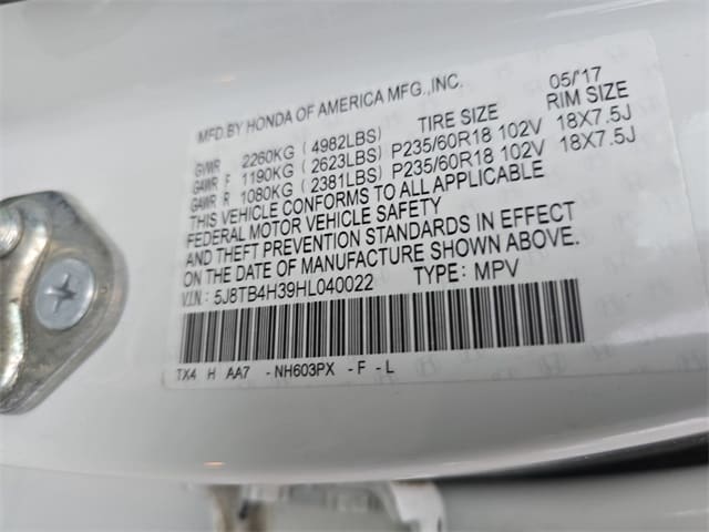 *ALUMINUM ALLOY WHEELS*, *LEATHER*, 4D Sport Utility, 3.5L V6 SOHC i-VTEC 24V, 6-Speed Automatic, AWD, White Diamond Pearl, Ebony w/Perforated Leather-Trimmed Interior, 18" x 7.5" Aluminum Alloy Wheels, 4-Wheel Disc Brakes, ABS brakes, Alloy wheels, CD player, Compass, Exterior Parking Camera Rear, Front Bucket Seats, Heated front seats, Heated Front Sport Bucket Seats, Leather Shift Knob, Leatherette-Trimmed Interior, Memory seat, Power driver seat, Power Liftgate, Power moonroof, Power passenger seat, Power windows, Remote keyless entry, Split folding rear seat, Steering wheel mounted audio controls, Telescoping steering wheel, Tilt steering wheel.