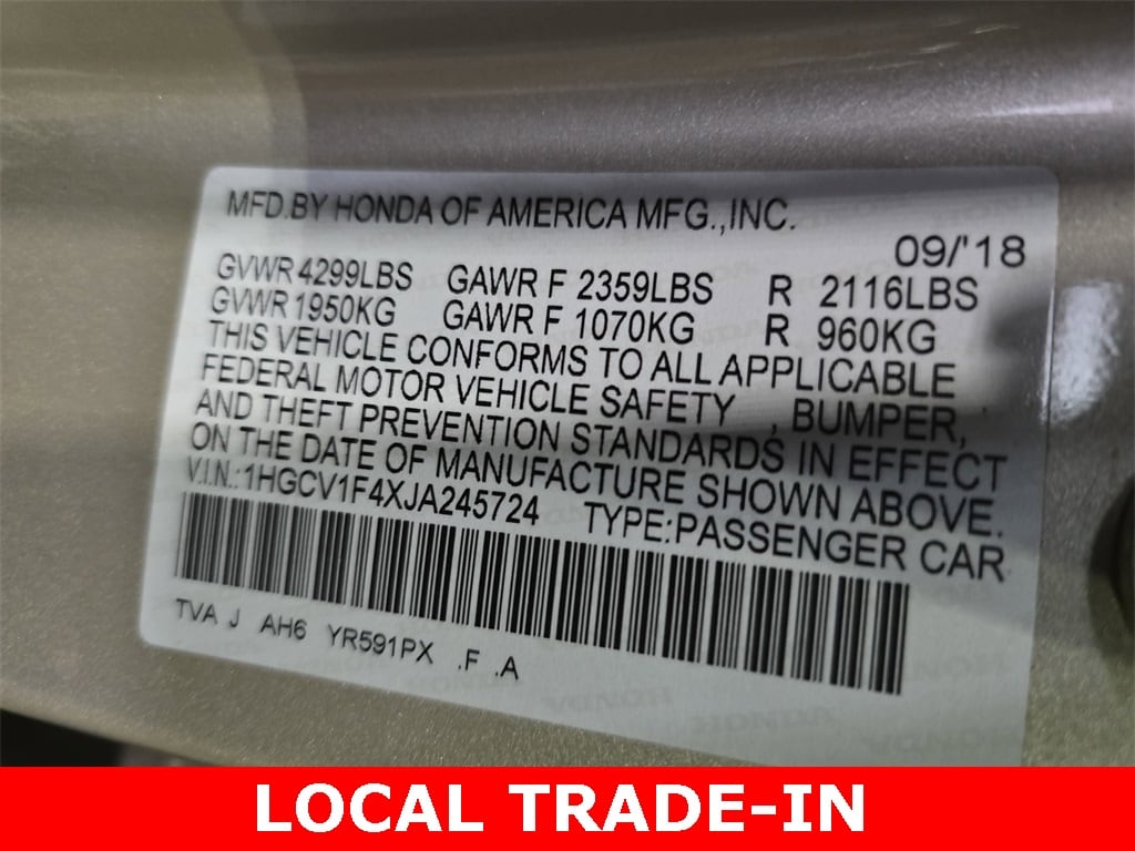 2018 Honda Accord EX 4 DOOR SEDAN Champagne Frost Pearl FWD CVT 1.5T I4 DOHC 16V Turbocharged VTEC *LOCAL TRADE*, *CLEAN HISTORY...NO ACCIDENTS REPORTED*, *BLUETOOTH*, Accord EX 4 DOOR SEDAN, 4D Sedan, 1.5T I4 DOHC 16V Turbocharged VTEC, CVT, FWD, Champagne Frost Pearl, Ivory w/Cloth Seat Trim, Air Conditioning, Front Bucket Seats, Heated Front Bucket Seats, Heated front seats, Power driver seat, Power moonroof, Radio: 180-Watt AM/FM/HD/SiriusXM Audio System, Split folding rear seat, Steering wheel mounted audio controls.