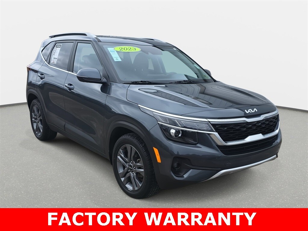 Recent Arrival! 2023 Kia Seltos S FWD Gravity Gray FWD CVT 2.0L I4 MPI Seltos S FWD, 4D Sport Utility, 2.0L I4 MPI, CVT, FWD, Gravity Gray, Black w/Sofino Premium Leatherette Seat Trim, Air Conditioning, Apple CarPlay & Android Auto, Cloth & Sofino Premium Leatherette Seat Trim, Emergency communication system: 911 Connect, Exterior Parking Camera Rear, Front Bucket Seats, Navigation Package, Radio: AM/FM/MP3 Display Audio w/Navigation, Split folding rear seat.